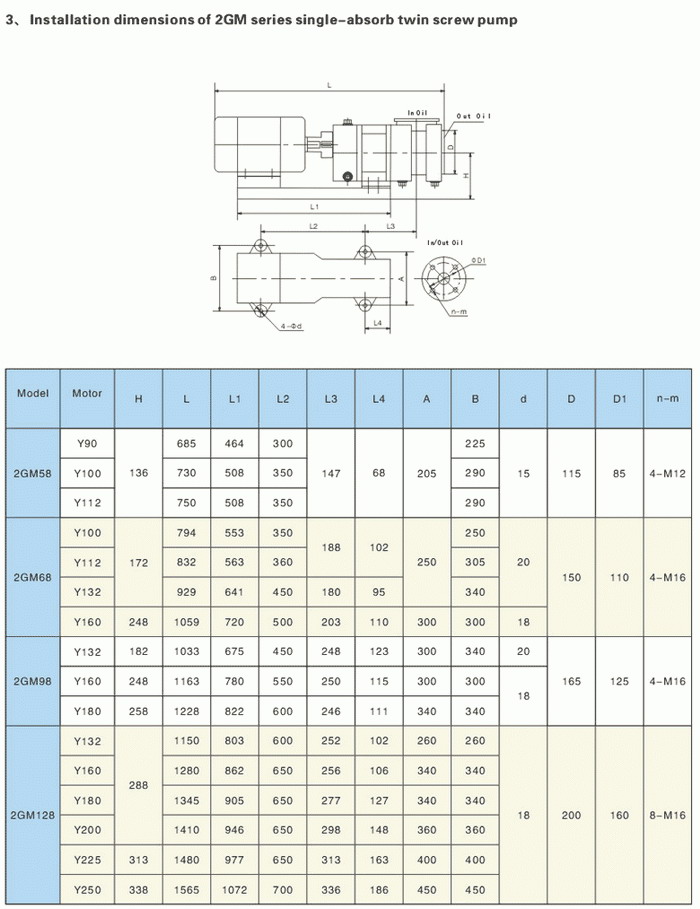 This product is a small external bearing type single-suction double screw pump,flux rangng 0.9-60m 3 /h,pressure 0.4-3MPa,without heating chamber or safety valve atached with.The bearing bore and pump bore are separated by mechanical seal and skeleton oil seal.Type are of good seat tughtness.It possesses the features go small volume,with application,ease in maintenance and wash.